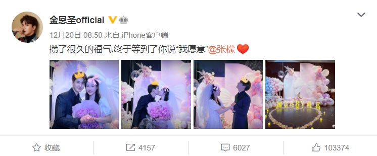 이에대해 장멍은 김은성의 공식발표이후 채 1분이 안돼 자신의 웨이보에 프로포즈 사진을 업로드하며 "한쪽 무릎 꿇기+너=워웬이(我愿意)"라고 달콤한 답변을 달았다.