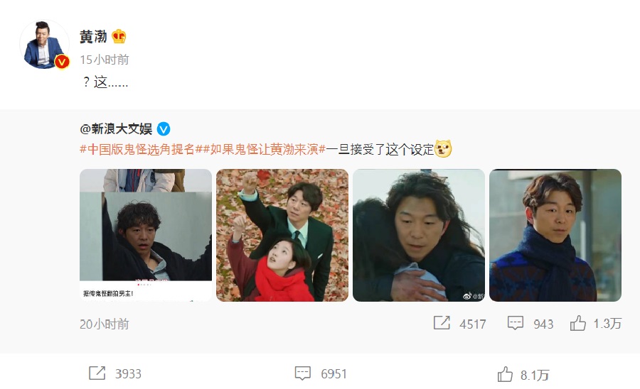 최근 한국드라마 《도깨비, 鬼怪》가 중국 버전으로 리메이크 한다는 소식이 전해졌고, 이는 수많은 중국 네티즌들과 드라마 팬들의 토론을 불러 일으켰다. 비록 지금으로선 《도깨비, 鬼怪》가 중국 버전으로 리메이크 한다는 소식은 명확하지 않다고는 하지만, 극 중 남주인공에 대해 수많은 네티즌들은 벌써부터 댓글에 자신들 각자의 의견들을 쏟아내고 있다.