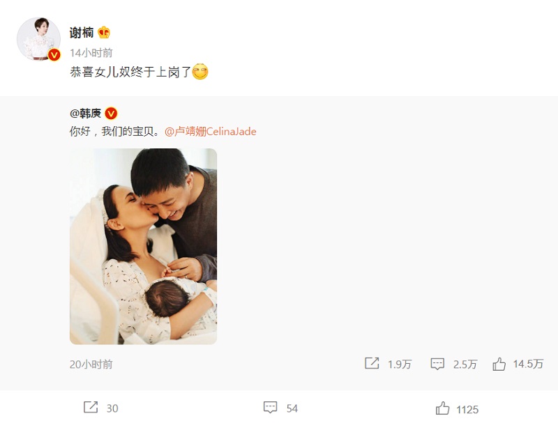 9월 9일 한겅(한경)과 셀리나 제이드(卢靖姗 루징샨) 부부는 웨이보에 "你好,我们的宝贝 안녕하세요, 우리의 보물입니다"라는 덧글과 함께 한가족 세식구의 행복한 사진을 업로드했다. 이러한 기쁜 소식이 알려지자 순식간 화제로 떠올랐다.