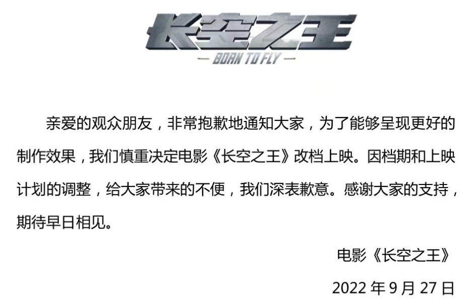 制作效果,我们慎重决定电影《长空之王》改档上映。因档期和上映