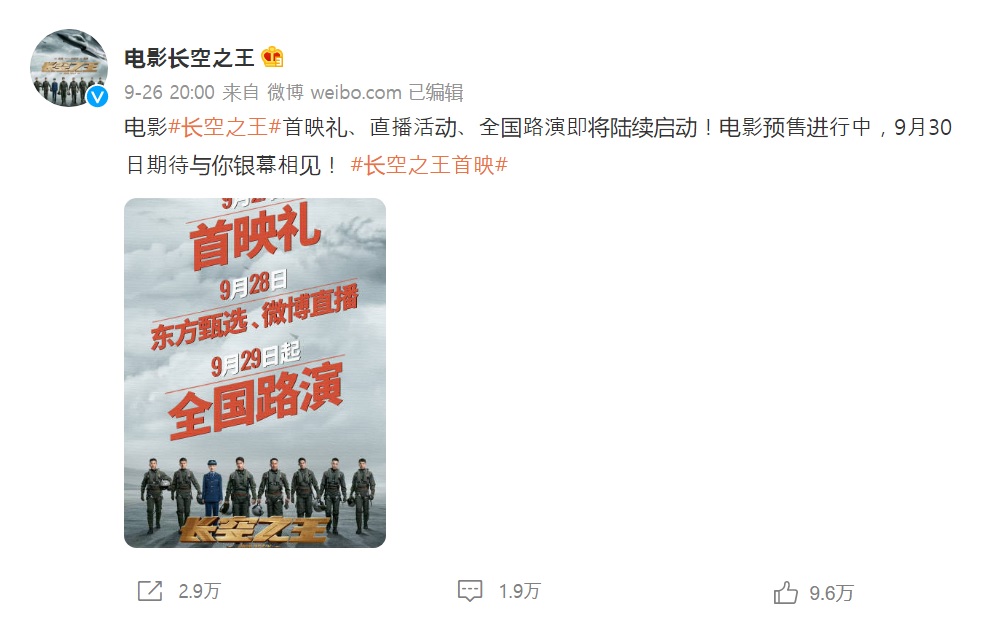 류샤오시(刘晓世 유효세) 감독, 프로듀서 한한(韩寒)으로, 왕이보(王一博 왕일박), 후쥔(胡军 후준), 위시(于适, Yosh Yu) 등 주연, 저우동위(周冬雨 주동우) 특별출연의 영화 《长空之王 장공지왕》의 개봉일이 원래 9월 30일로 정해 졌었다. 영화의 공식 웨이보를 보더라도 지금까지 발표한 모든 홍보물 또한 9월 30일로 개봉일정이 확정되어 있고, 모든 매체와의 협력과 온오프라인 활동 역시 원래 개봉일정에 맞춰 추진돼 왔다.