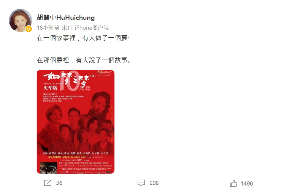 공유한 포스터의 내용을 보면 후후이중이 중국 내지에서 정식으로 컴백한다는 것을 알 수 있다. 그녀가 쉬칭(许晴 허청), 샤오잔(肖战 초전), 장량(张亮), 황루(黄璐 황로), 콩웨이(孔维 공유) 등과 함께 연극 《如梦之梦 여몽지몽》의 한무대에서 열연을 펼치는 것이다. 이는 또한 그녀가 처음으로 중국 내지 연극무대에 서는 것이다.