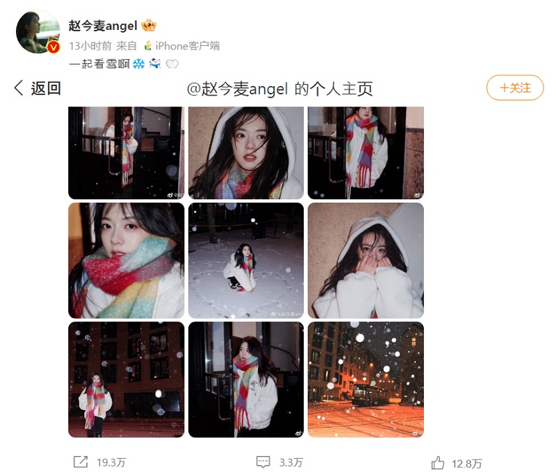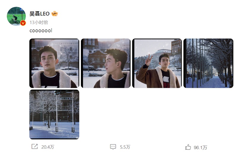우레이(오뢰)와 자오진마이(조금맥)는 각각 자신들의 웨이보에 《在暴雪时分 재폭설시분》 핀란드 설경사진을 업로드 했다. 선남선녀와 설경이 너무나도 잘 어울리고, 이들의 컨디션은 매우 좋아 보이며, 이들의 눈빛에는 하고싶은 이야기로 가득한 모습을 보이고 있다. 정말이지 아름다운 청춘의 모습으로 최고의 비주얼을 보이고 있어 누가 봐도 "너무 잘 어울린다"고 말할 수 밖에 없을 것이다.