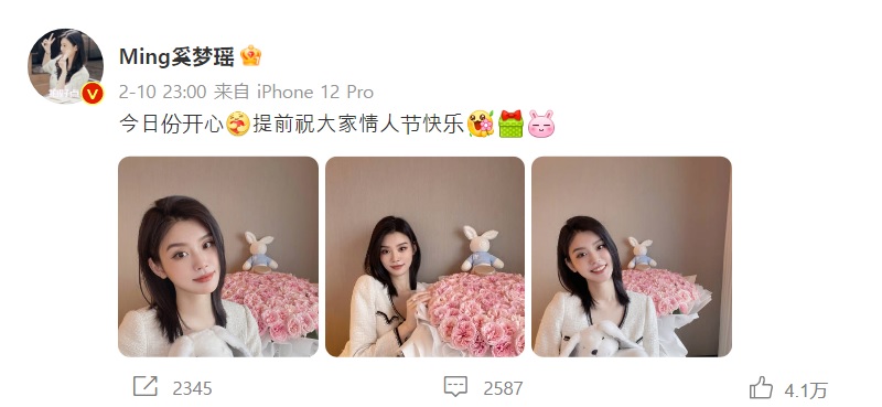 시멍야오(해몽요, Minf Xi)는 자신의 웨이보에 발렌타인데이에 처음으로 애정을 과시했다. 마리오 호(何猷君 하유군)에게는 아름다운 아내가 있기에 발렌타인데이가 아직 오지 않았을 때 일찌감치 선물을 준비했다. 가득한 핑크로 소녀의 마음 사로잡기!