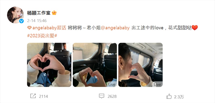 오랫동안 움직임에 대해 업로드하지 않았던 안젤라베이비 또한 발렌타인데이인 2월 14일 오후 "情人, 연인"과 관련된 동태를 공유했다. 그녀는 카메라를 향해 양손으로 하트를 그려 보이며 자신의 완벽한 마음을 드러냈다. 그녀는 베이지색의 맨투맨에 청바지를 코디한 매우 심플한 모습으로 젊고 활력 넘치는 모습을 보이고 있다.