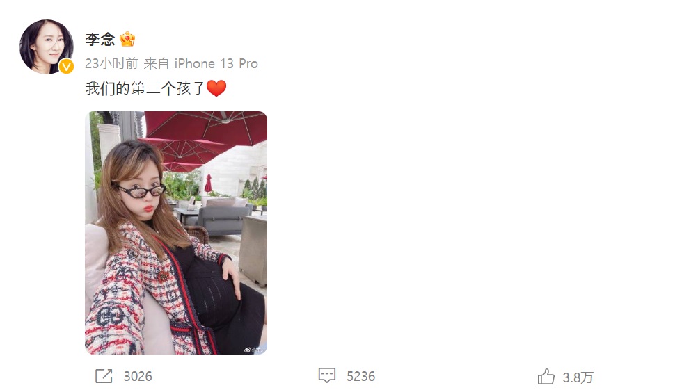 2월 20일 이미 37살인 고령의 여배우 리녠(이념)은 자신의 웨이보를 업로드하며 셋째아기를 임신했음을 공식적으로 선언하며 임신한 모습의 사진을 첨부해 공유했다. 리녠이 공유한 사진을 보면 배가 이미 많이 불러있어, 곧 출산을 앞두고 있는것 같이 보여진다.