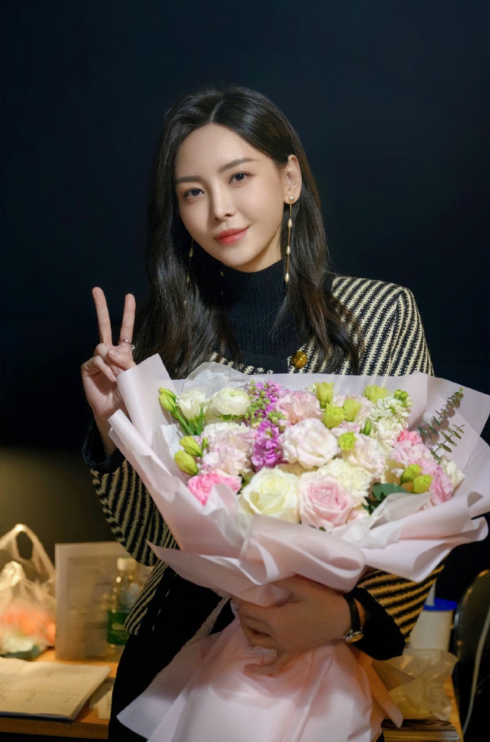 크랭크업 축하 꽃다발을 안고있는 장티엔아이는