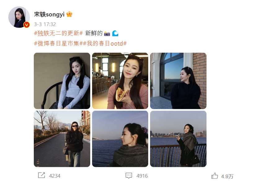 며칠 전 송이는 자신의 웨이보에 몇장의 사진을 업로드 했고, 그 중 한장의 사진속에 그녀는 청바지에 블랙 상의를 입고 선그라스를 낀 채 한 건물 앞 도로에 서있는 사진이 있다. 도로의 양쪽엔 벌거벗은 나무와 적막한 잔디밭만이 있다.