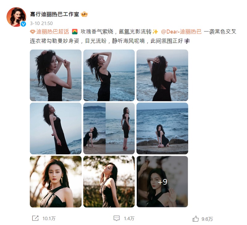 디리러바공작실은 3월 10일 밤 웨이보에 디리러바가 해변에서 촬영한 화보 사진을 업로드했다. 디리러바는 세련된 메이크업을 하고 금빛으 큰 귀걸이를 하고 있으며, 무릎까지 내려오고 몸메 딱맞는 블랙의 원피스를 입고 있는 모습은 군살없는 아름다운 몸매를 더욱 돋보이게 해주고 있다. 그리고 앞가슴과 등 뒤의 삼각형으로 열려있는 모습에서 눈처럼 하얀 피부가 눈길를 잡아끈다.