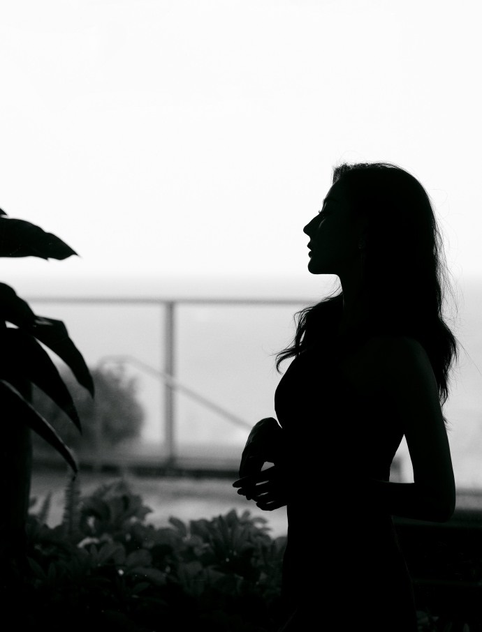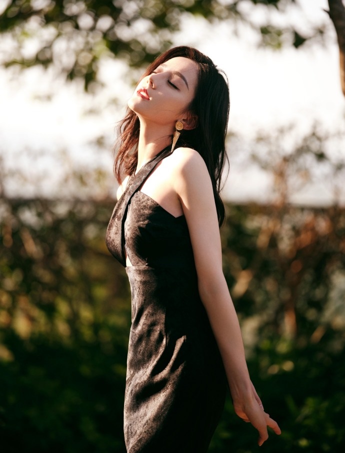 一袭黑色交叉连衣裙勾勒曼妙身姿,目光流盼,