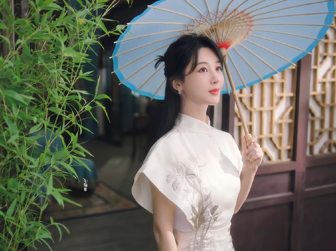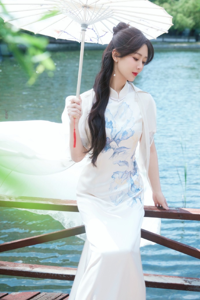 공개된 자료 사진에서 양쯔는 은백색 치파오를 입었고, 치파오에는 세련되고 고전적인 백합화가 수놓여 있으며 비단같은 긴 머리카락은 자연스럽게 흐트러져 있다.