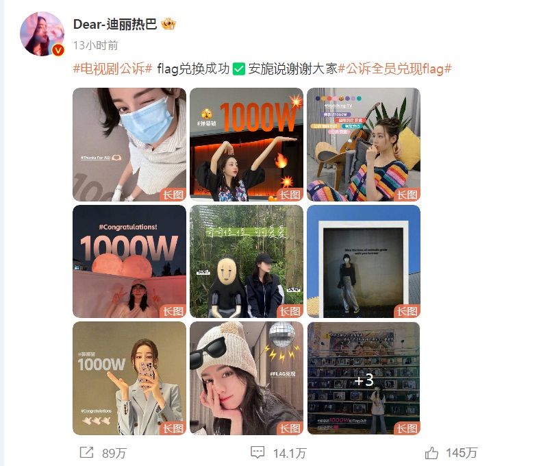 6월 16일 중국의 여성스타 디리러바(Dilraba)가 자신의 웨이보에 약속을 이행하며 실제로 100장이 넘는 셀카를 업로드해 많은 네티즌들의 관심과 토론을 불러 일으켰다.