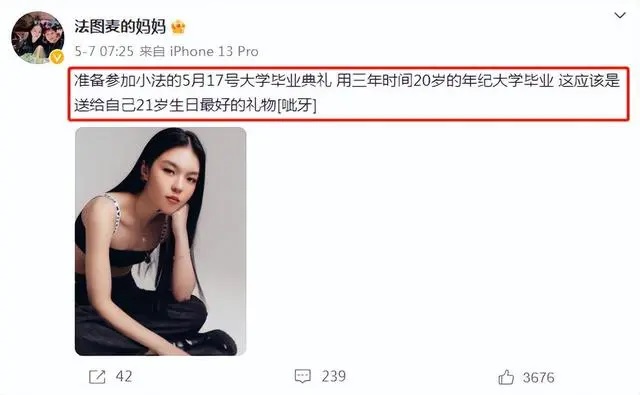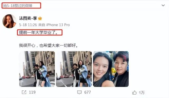 올 지난 5월 7일 파투마이·리의 어머니 하원(哈文 합문) 또한 웨이보에 글을 올려 딸이 대학을 졸업한다는 기쁜 소식을 알렸고, 딸이 21살 생일에 자신에게 주는 가장 좋은 선물인 것 같다며 기쁨을 감추지 못했다. 그리고 같은 달 18일에 파투마이·리 또한 글을 업로드하며 1년을 앞당겨 대학을 졸업하고, 자신은 정말 기쁘다고 소식을 전했다.