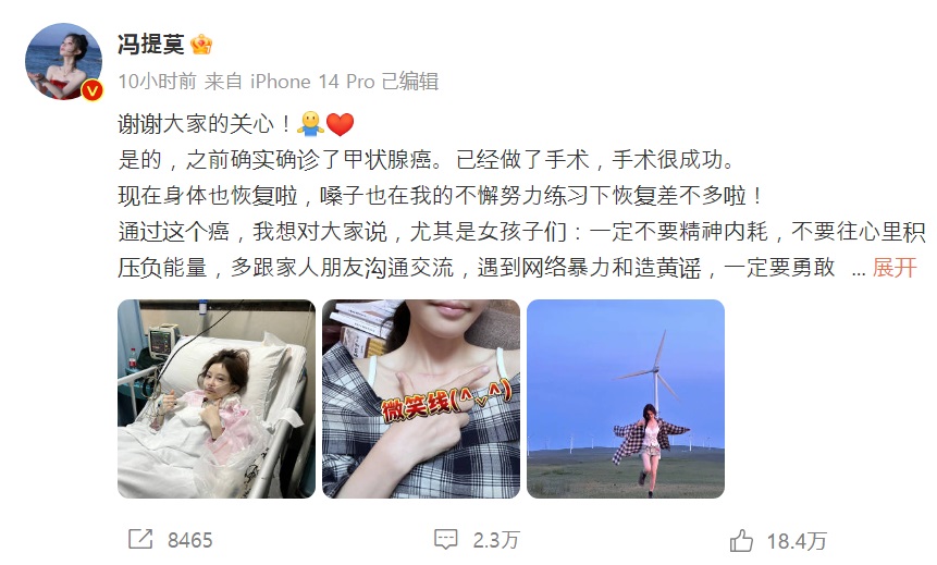 짧은 동영상 플랫폼에서 한때 인기를 끌었던 중국 내지 가수 펑티모(冯提莫, Timo Feng)가 오랫동안 자취를 감추고 있었다. 그리고 7월 24일 저녁, 그녀는 갑자기 자신은 갑상선암에 걸렸었으며, 이미 수술을 마치고 회복 중이라고 스스로 털어놨다. 그리고 이와 관련된 화제 또한 실검 검색어를 폭발시켰다.