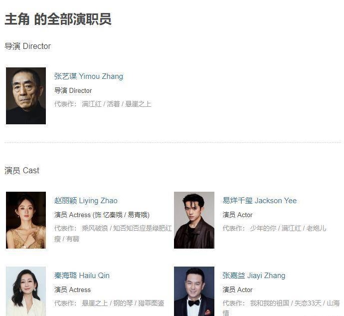 자오리잉이 장이머우 감독과 다시 호흡을 맞추어 화제가 된것 이 외에, 현재 문화 공유 사이트 더우반(豆瓣)에 드러나 있는 드라마 《主角 주각》의 배우 라인업 또한 매우 막강하다. 공개된 배우 라인업에는 인기 남성배우 이양첸시(易烊千玺 이양천새)를 비롯하여 장쟈이(张嘉益 장가익), 친하이루(秦海璐 진해로) 등 두 명의 공인된 실력파 배우 또한 자리하고 있다. 이로볼 때 인기, 비주얼, 연기 실력 등 부족함이 전혀 없다라고 말할 수 있다.