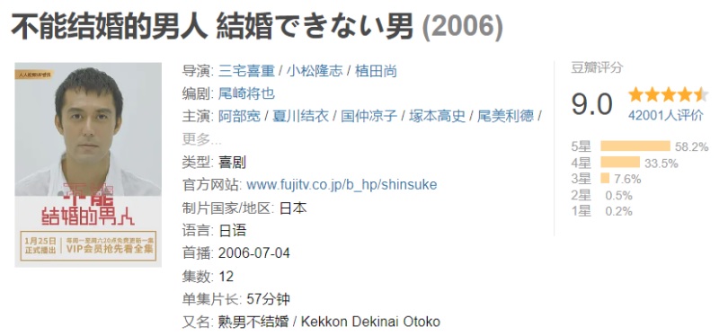 일본 드라마 《不能结婚的男人 불능결혼적남인, 結婚できない男》의 문화 컨텐츠 플랫폼 더우반(豆瓣)에서의 평점은 9.0에 달하고 있으며, 거의 호평 일색이다. 평점을 살펴보면, 별 한개는 없고 별 두개 또한 거의 없다는 것을 알 수 있다.