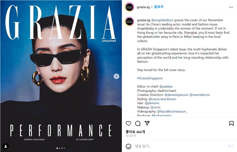 11월 15일 유명잡지 그라지아(GRAZIA) 싱가포르 판이 안젤라베이비의 새 잡지 커버를 공식 발표했다. 이로서 안젤라베이비는 이미 해외에서 조용히 활동재개 했다는 것을 알 수 있다. 하지만 이번 안젤라베이비의 커버 사진은 정말 많은 사람들에게 큰 놀라움을 안겨줬다.