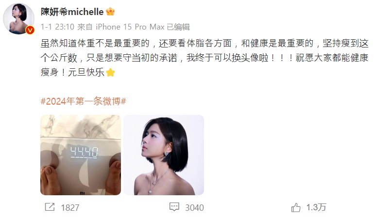 2024년 새해 첫 날, 중국의 여성스타 천옌시(진연희)는 sns에서 팬들에게 큰 선물을 보냈다. 바로 그녀가 자신의 체중을 공개한 것으로, 그 숫자는 모두가 부러워 하는 44.4킬로그램에 머물러 있었고, 그녀는 자신이 5킬로그램 다이어트하는데 성공했다고 밝혔다.