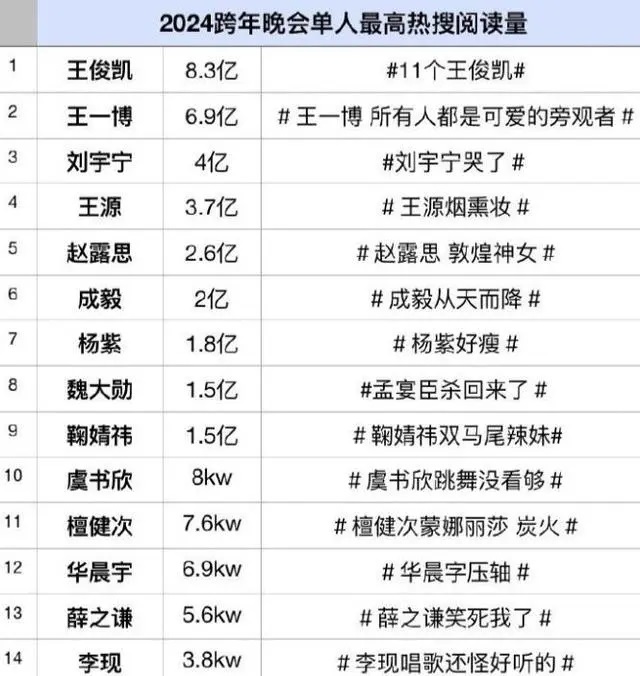 시청자들에게 있어 어느 위성TV의 만회를 시청할 것인가의 선택은 대부분 초청된 스타들의 라인업에 의해 결정된다. 예를들어 양쯔(杨紫 양자), 왕허디(王鹤棣 왕학체), 웨이따쉰(魏大勋 위대훈), 왕쥔카이(王俊凯 왕준개), 왕위엔(王源 왕원) 등 스타들 모두 방대한 팬층을 소유하고 있어 그들이 일단 모습을 드러내기만 해도 시청자들의 시청률은 반드시 상승하게 되어있다.