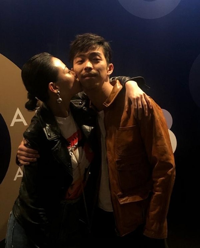 한 손은 다정하게 탄줘의 어깨를 끌어안고 있으며, 눈을 감고 그녀의 얼굴에 다정하게 기대어 있다. 두 사람은 이렇게 함께 사진을 찍으며 너무나도 친밀한 애정을 드러내 보이고 있다.