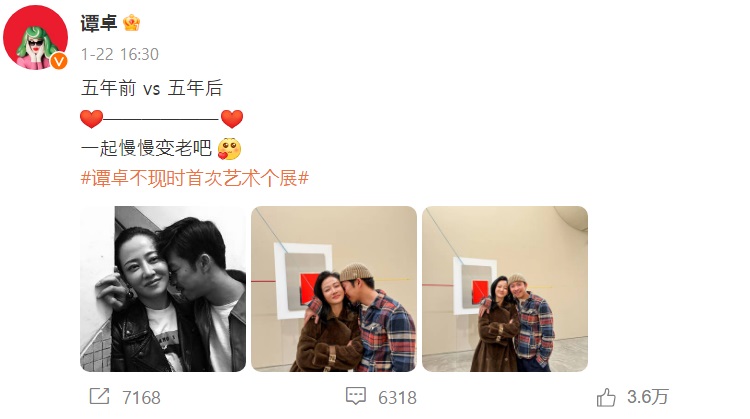 탄줘는 웨이보에 "五年前vs五年后,让我们一同携手慢慢变老吧 5년 전 vs 5년 후, 우리 함께 손을 잡고 천천히 늙어가요"라고 글을 업로드했다. 깊은 감정이 묻어 나오는 말에 하트와 키스를 날리는 이모티콘을 함께 올렸으며, 하트와 하트 사이 뭔가 전하고 싶은 말이 있는듯 해 보였으며, 이는 마치 이들 연이 사이의 비밀스런 어떠한 용어가 아닌가 하는 추측을 하게 했다.