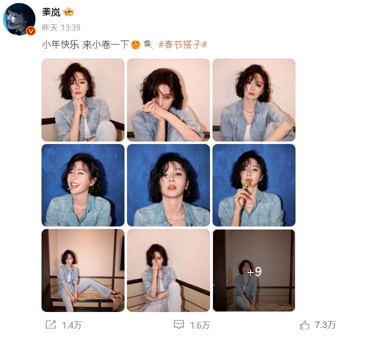 춘지에(春节 춘절)이 다가오고 있는 이 때, 중국의 여성스타 친란(진람) 또한 모든 이들을 위해 아주 특별하게 축복을 보냈다. 그녀는 웨이보에 독특한 곱슬머리 스타일의 사진을 업로드하며 "행복한 샤오녠(小年)이예요, 곱슬머리를 해 봤어요"라고 덧글을 달았다.