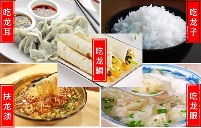 "吃龙食 흘용식, 용의 밥 먹기"도 그 중 하나이다. "龙食 용식"이란 실제로 용을 먹는 것이 아니라 일부 음식들은 용과 용과 연결시켜 특별한 의미를 부여하는 것이다. 예를들어 국수(面条)는 길쭉한 모양 때문에 "롱쉬몐(龙须面 용수면, 용 수염 면)"으로 형상화하여 부르고, 물만두(水饺)는 물속에서 뒹굴고 있는 모습 때문에 "롱얼(龙耳 용이, 용의 귀)"에 비유하며, 춘병(春饼)은 동그란 모양으로 인해 "롱린(龙鳞, 용의 비늘)"이라는 미칭을 부여 받았다.