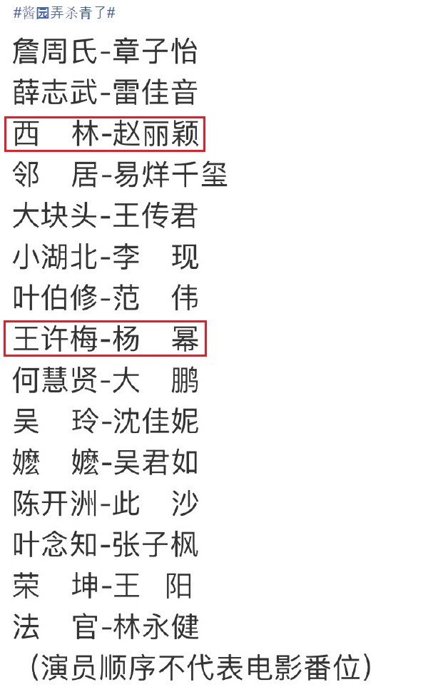 비록 천커신 감독이 배우 순서가 영화 판웨이(番位, 홍보물과 영화 엔딩 크레딧에서 이름이 올라가는 순서)를 대표하는 것이 아니라고 거듭 강조했지만, 여전히 양미가 영화 자원 방면에 있어 이미 자오리잉을 능가하지 못한다는 것을 느낄 수 있다. 특히 자오리잉이 아시안 필름 어워즈에서 AFA 차세대상을 수상하고, 장이머우 감독과 《第二十条 제 20조》를 합작한 이후 더욱 그렇게 느껴진다. 따라서 이번 영화 《酱园弄 장원롱》의 판웨이(番位)에서 아마도 양미는 자오리잉과 비교할 수 없었을 지도 모른다.