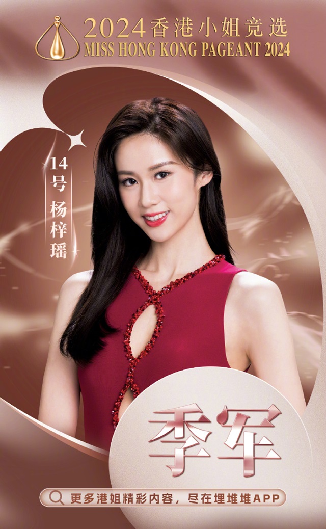 9월 15일, 2024 미스 홍콩 선발대회가 홍콩에서 거행됐다. 선발대회에서 뜨거운 인기를 한몸에 받았던 니러린(倪乐琳 예악림, Ellyn)이 챔피언을 차지했고, 량쟈잉(梁嘉莹 양가영, Emily)이 2위를 차지함과 동시에 이번 대회에서 가장 사진을 잘받는 미스 포토제닉상을 함께 받았다. 그리고 3위 양쯔야오(杨梓瑶 양재요, Amina)는 "人气王 인기왕"으로서 재능여신대상 및 지혜로운 100선여신 등 두 개의 상을 동시에 수상했다.