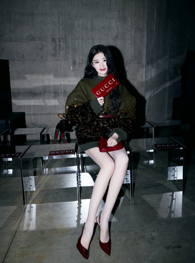 중국 연예계에서 누가 디자이너의 마음을 가장 안심시킬 수 있을까를 말하자면, 왕추란은 단연 3위 안에 이름을 올릴 것이다. 세련된 골격, 좁은 어깨, 거기에 가녀린 손목까지 그야말로 타고난 걸어다니는 옷걸이이다. 이번 구찌 쇼장에서 그녀가 선택한 이 드레스는 빨간색 가는 허리띠와 조화를 이루며 고급스러운 느낌을 가득차 있어 패션 블로거들의 찬사를 받았다.