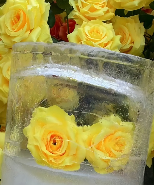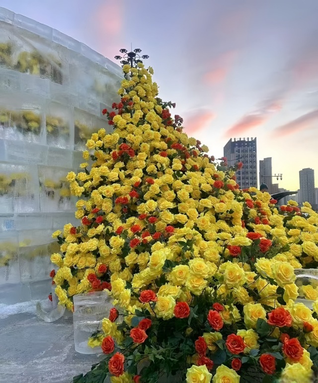 하얼빈(哈尔滨)의 겨울에 또 다른 경관이 펼쳐졌다. 얼음과 눈의 세계에는 동화와도 같은 얼음 조각이 있을 뿐만 아니라, 얼음으로 감싸여진 노란 장미의 독특한 자연의 경이로움이 함께하고 있었다. 추위에 의해 얼음꽃으로 조각된 장미들은 추위 속에서도 여전히 피어나고 있는 듯하며, 이러한 중국 북부 도시에 낭만과 신비로움을 더해주고 있다.