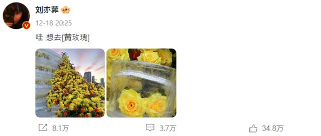 그리고 12월 18일 중국의 여배우 류이페이(유역비)가 자신의 웨이보에 이러한 눈과 얼음의 기이한 경관에 대한 동경을 밝혔다. 그녀는 하얼빈의 얼음에 감싸져 있는 노란 장미를 직접 보고 싶다고 사진과 함께 덧글을 달아 네티즌들의 뜨거운 관심을 불러 일으켰다.