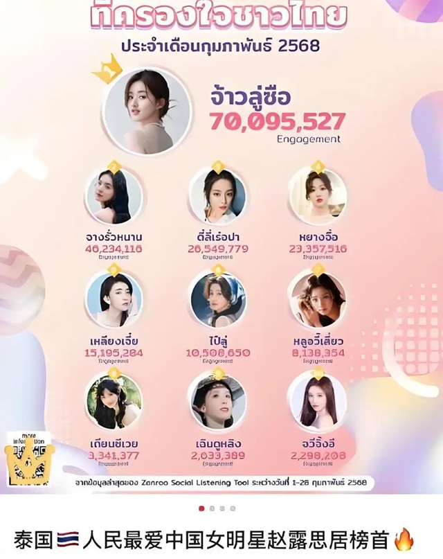 자오루스와 양쯔 외에 태국 시청자들의 중국 여성 스타에 대한 사랑은 꾸준히 확대되고 있다. 그 중 천두링(陈都灵 진도령)은 맑고 새로운 이미지와 독특한 기질로 태국 시청자들의 시선을 사로잡는데 성공했다.