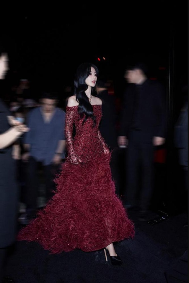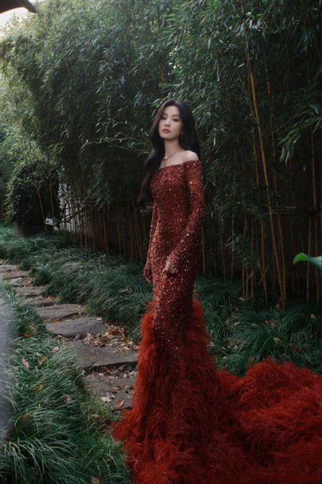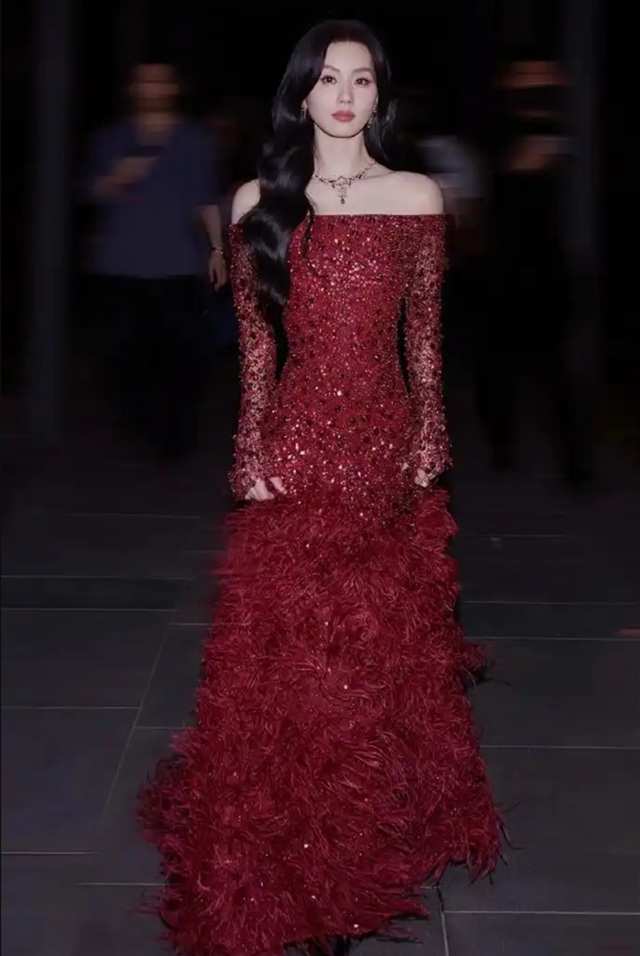 류스스는 엘리 사브(Elie Saab) 2024 추동 오트쿠튀르 컬렉션의 빨간색 깃털 장식 드레스를 입었고, 이 스타일은 동양의 고전적인 매력과 현대적인 세련미를 교묘하게 융합하여 강렬한 시각적 매력을 만들어 냈다.
