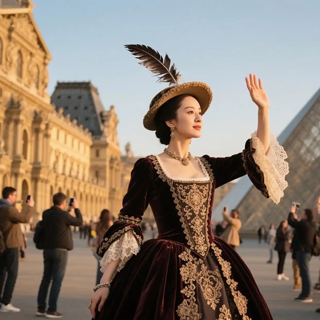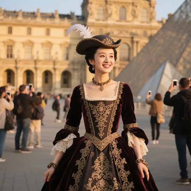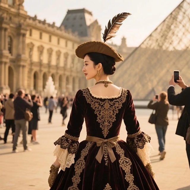 루브르 박물관에서 18세기 화려한 의상 입고